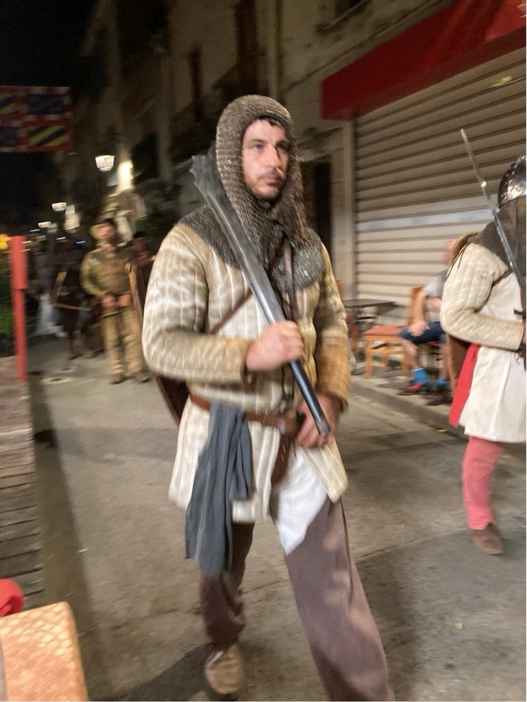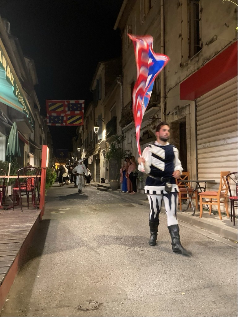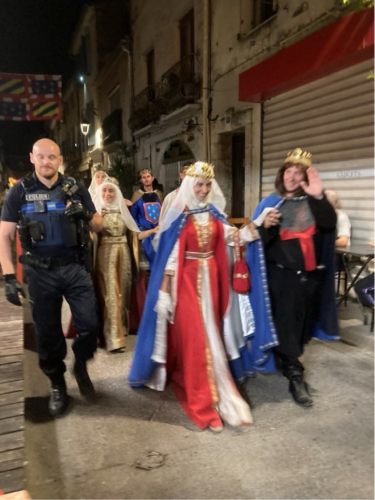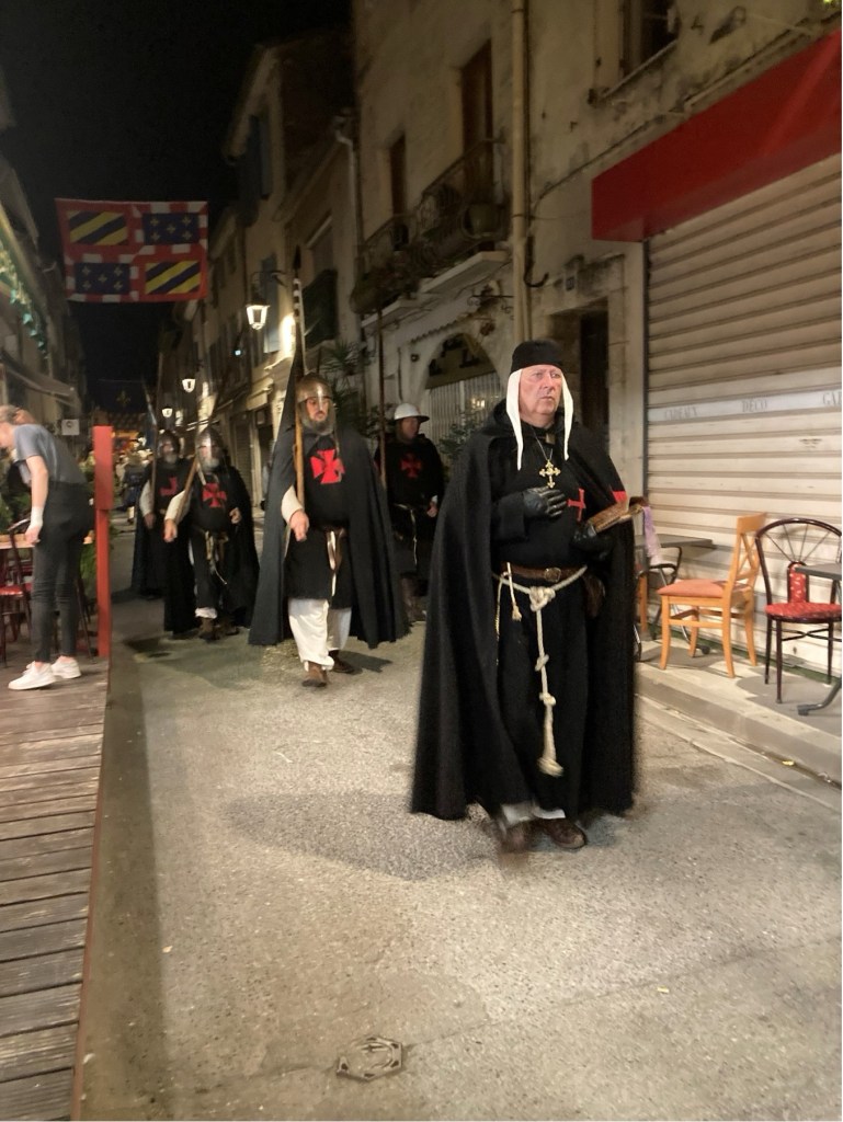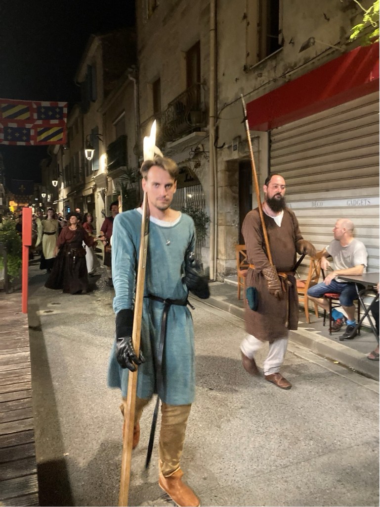 My brother Andrew published his scholarly history of the Mackenzies, ‘May we be Britons?, back in 2012, and I researched the medieval section of this. The two of us were then keen to visit Aigues-Mortes. However, in the event, when we arranged this, a somewhat complicated journey presented us with a badly delayed train on one of the final legs of our successive connections from Annecy in Haute-Savoie (where, at the picturesque Talloires, just down this Alpine lake, we had been staying in one of our very favourite holiday destinations). So, we only arrived in Aigues-Mortes late in the evening, after having to complete the final leg of our journey by means of a long taxi ride. Yet, serendipitously, after quickly checking into our hotel, we found, some way off the main, central square of the town, an Indian restaurant. This was one of the very few restaurants still open, and we were lucky enough to find a table there, outside, on the narrow street. Like all the other streets in the marvellously preserved and wonderfully atmospheric little walled town, it was part of the grid-pattern of streets which had been constructed in King Louis’ reign. During our dinner, a fantastic medieval costumed procession suddenly appeared, and made its way straight past the table where we were sitting. The spectacle was complete with standard bearers, drummers, medieval bishops, knights and their ladies, a king and queen, a princess and her attendant, soldiers, peasants, dogs, sheep, and a miniature pony. When we had finished our meal, we followed the crowds and found that this costume carnival led on to one of the main 13th-century gateways which punctuated the walls, and opposite what a couple of days later we saw to be the town’s pink salt lake, the Etang de la ville. Above the gateway and its adjoining walls, there then began a spectacular firework display. When this was over, and most of the crowd of temporary tourists had dissipated, we followed the actor-participants, and joined them, letting their hair down, in a makeshift medieval inn, serving beer – which had been constructed in the form of a structure with straw-covered floor and a temporary roof made of reeds, beneath the walls of a corner of the fortress, and just beyond where the participating animals has been penned. So as to give a flavour of how the town might have appeared in King Louis and Kenneth’s time, some of the photographs which I took during this festival, Le Rassemblement Medieval d’Aigues-Mortes,follow. After these, I will pick up my detective story again.