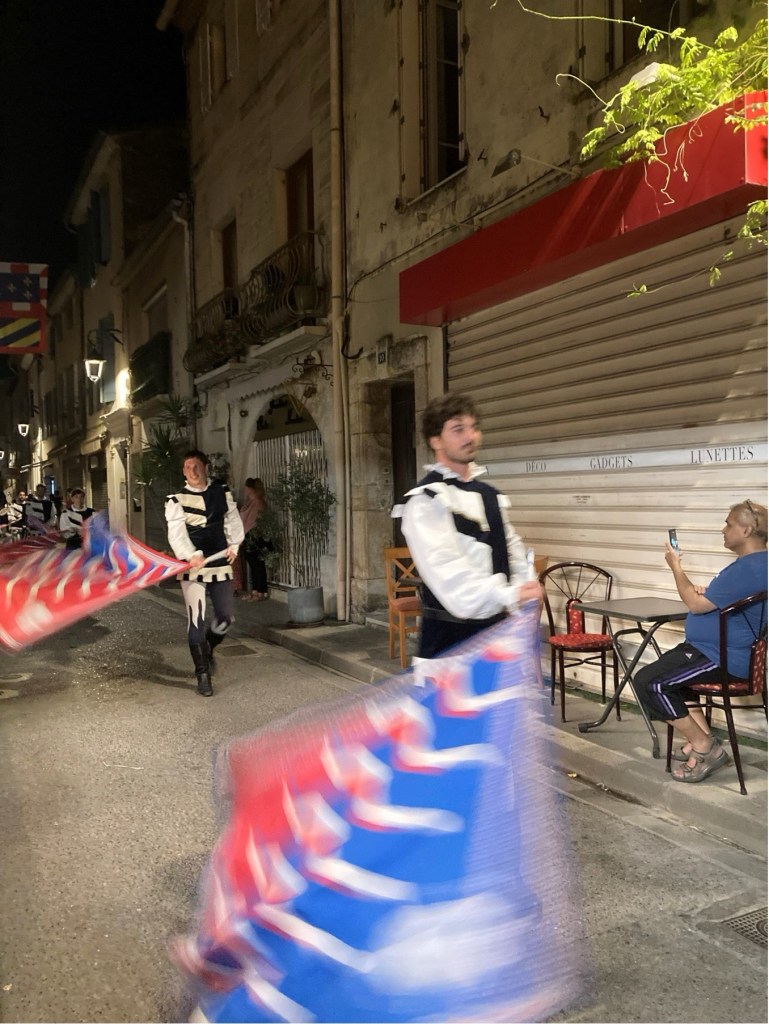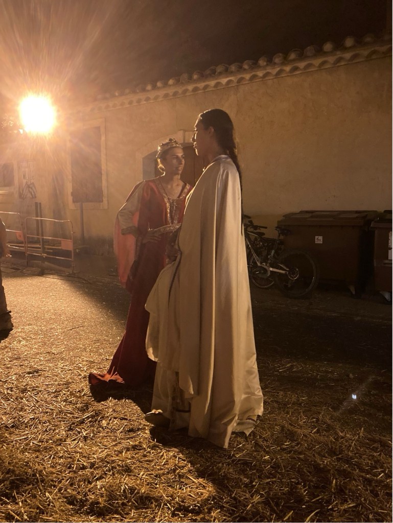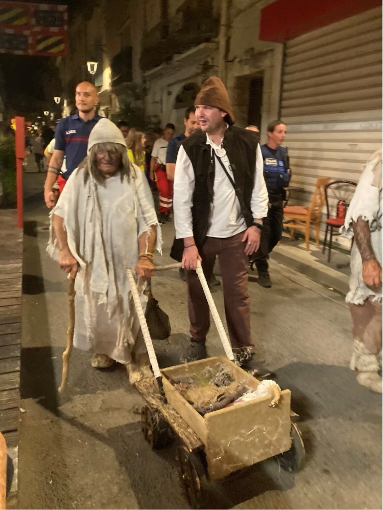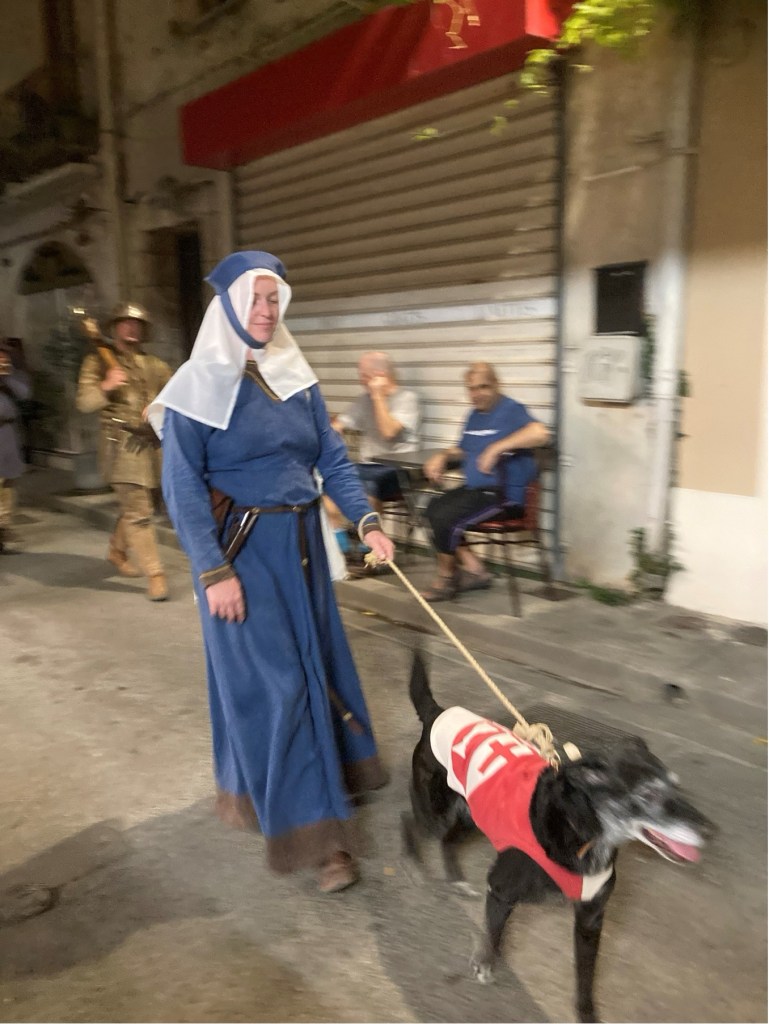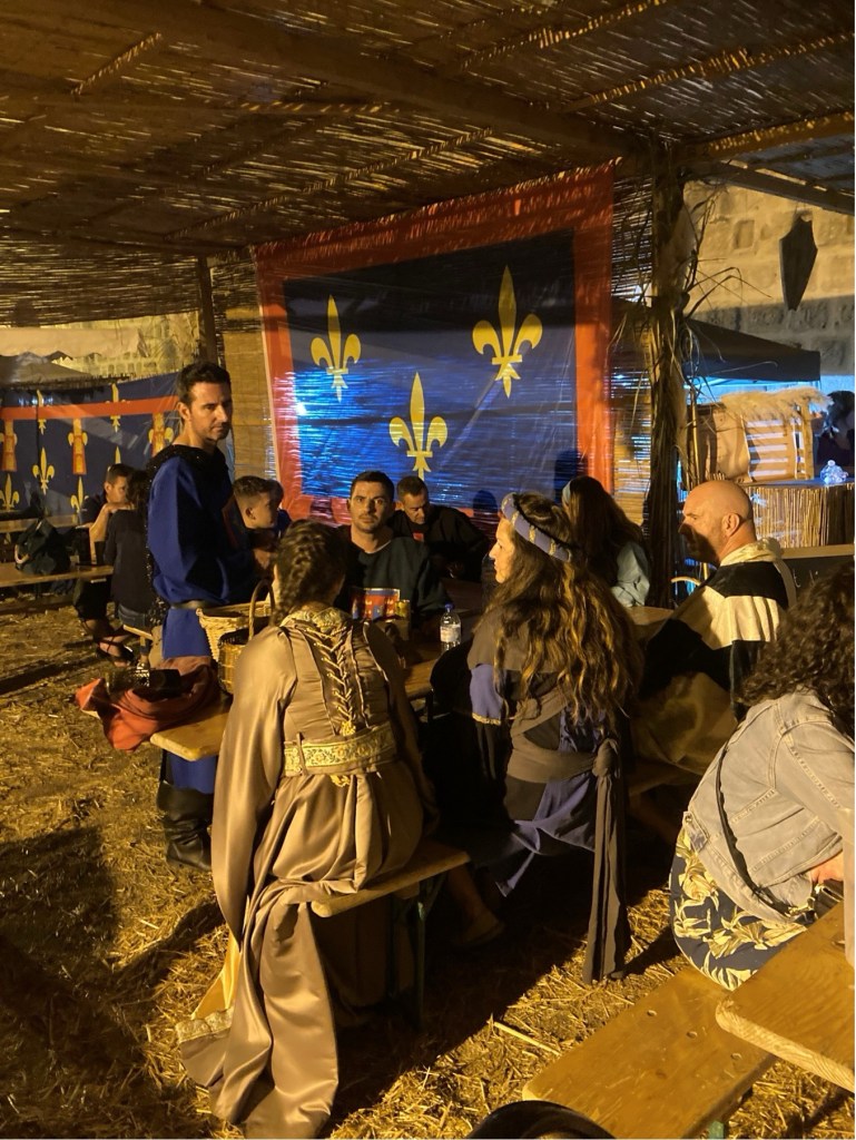 My brother Andrew published his scholarly history of the Mackenzies, ‘May we be Britons?, back in 2012, and I researched the medieval section of this. The two of us were then keen to visit Aigues-Mortes. However, in the event, when we arranged this, a somewhat complicated journey presented us with a badly delayed train on one of the final legs of our successive connections from Annecy in Haute-Savoie (where, at the picturesque Talloires, just down this Alpine lake, we had been staying in one of our very favourite holiday destinations). So, we only arrived in Aigues-Mortes late in the evening, after having to complete the final leg of our journey by means of a long taxi ride. Yet, serendipitously, after quickly checking into our hotel, we found, some way off the main, central square of the town, an Indian restaurant. This was one of the very few restaurants still open, and we were lucky enough to find a table there, outside, on the narrow street. Like all the other streets in the marvellously preserved and wonderfully atmospheric little walled town, it was part of the grid-pattern of streets which had been constructed in King Louis’ reign. During our dinner, a fantastic medieval costumed procession suddenly appeared, and made its way straight past the table where we were sitting. The spectacle was complete with standard bearers, drummers, medieval bishops, knights and their ladies, a king and queen, a princess and her attendant, soldiers, peasants, dogs, sheep, and a miniature pony. When we had finished our meal, we followed the crowds and found that this costume carnival led on to one of the main 13th-century gateways which punctuated the walls, and opposite what a couple of days later we saw to be the town’s pink salt lake, the Etang de la ville. Above the gateway and its adjoining walls, there then began a spectacular firework display. When this was over, and most of the crowd of temporary tourists had dissipated, we followed the actor-participants, and joined them, letting their hair down, in a makeshift medieval inn, serving beer – which had been constructed in the form of a structure with straw-covered floor and a temporary roof made of reeds, beneath the walls of a corner of the fortress, and just beyond where the participating animals has been penned. So as to give a flavour of how the town might have appeared in King Louis and Kenneth’s time, some of the photographs which I took during this festival, Le Rassemblement Medieval d’Aigues-Mortes,follow. After these, I will pick up my detective story again.