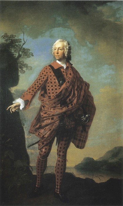 Later portraits such as those of John Campbell of Ardmaddie by William Mosman (1749), Norman MacLeod of MacLeod by Alan Ramsay (1748), or Sir Alexander MacDonald of Sleat (c.1775), show their subjects in full Highland dress within the period of Proscription. These are bold statements in terms of British politics, the sitters appearing to assert a right to wear tartan. Another element of these compositions seems to be the Highlander as classical archetype, for example in the portrait in Dunvegan in which Norman MacLeod, known to tradition as ‘The Red Man’, was painted in a mood of senatorial and classical nobility, in the pose of the Apollo Belvedere, at the time the most admired of all the known sculptures from antiquity. Pompeo Batoni’s (for Scotland) exceptional portrait of Colonel John William Gordon of Fyvie, soldier and Member of Parliament, was painted in Rome in 1766, the subject in his thirtieth year, in military uniform with kilt and plaid folded toga-like round his body. Here we have a Classical hero or inheritor of Classical values, the seated statue of Roma to his left offering him the orb of command and the wreath of the victor. Campbell of Ardmaddie in a doublet and plaid in red and black tartan, with sword, dirk, pistol and powder horn, displays this ambivalent but iconic image, dressed and accoutred as though the Act of Proscription supplied his dress code! He was a lawyer and banker in Edinburgh, Principal Cashier to the Royal Bank of Scotland, moving in the fast-stream of British commerce and choosing to have himself painted in Highland dress with the traditional arming of the Highlander. He was a popular figure and the subject of a bardic tribute by the Gaelic poet, Duncan Bàn Macintyre. He was certainly overtly Whig and Hanoverian in his politics but, like Macintyre, probably royalist in his native Gaelic mindset and upbringing, and ever mindful perhaps of the traditional ‘prophecy’ of a Gaelic resurgence. Before even the death of Bonnie Prince Charlie himself in 1788, the Highlander had emerged as a heroic and ‘classical’ figure, the legatee of primitive virtues.
